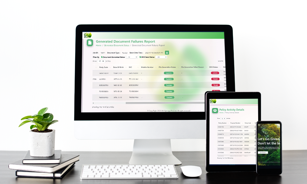 Go-Green e-Doc Portal is for the environment conscious corporate citizen, seeking enhanced operational productivity through digitally enabled, green business operations. The Go-Green solution brings the environmental sustainability initiatives into a meaningful implementation, by enhancing customer servicing and business delivery through initiatives that increase the digital customers. With multiple implementations across diverse internal operations of enterprises, the solution has now evolved to cater to both B2C and B2B document flows.